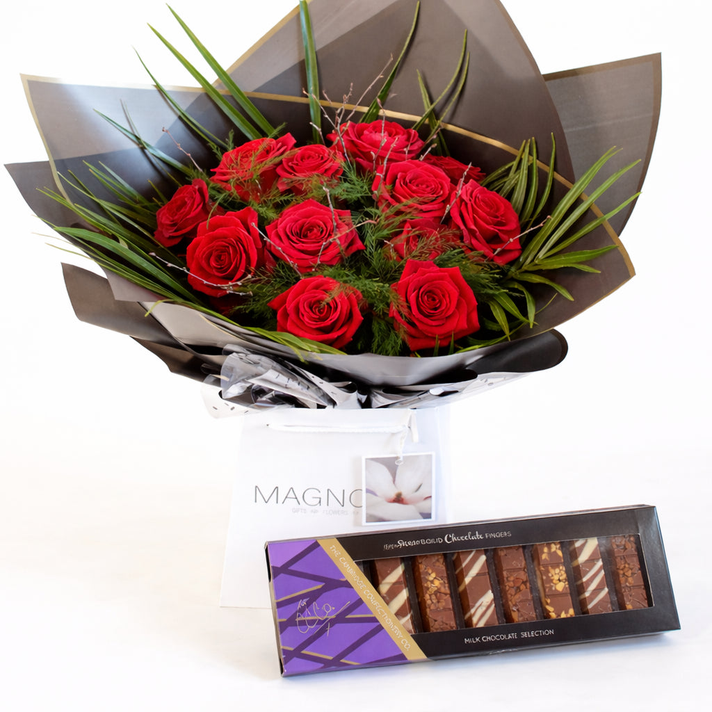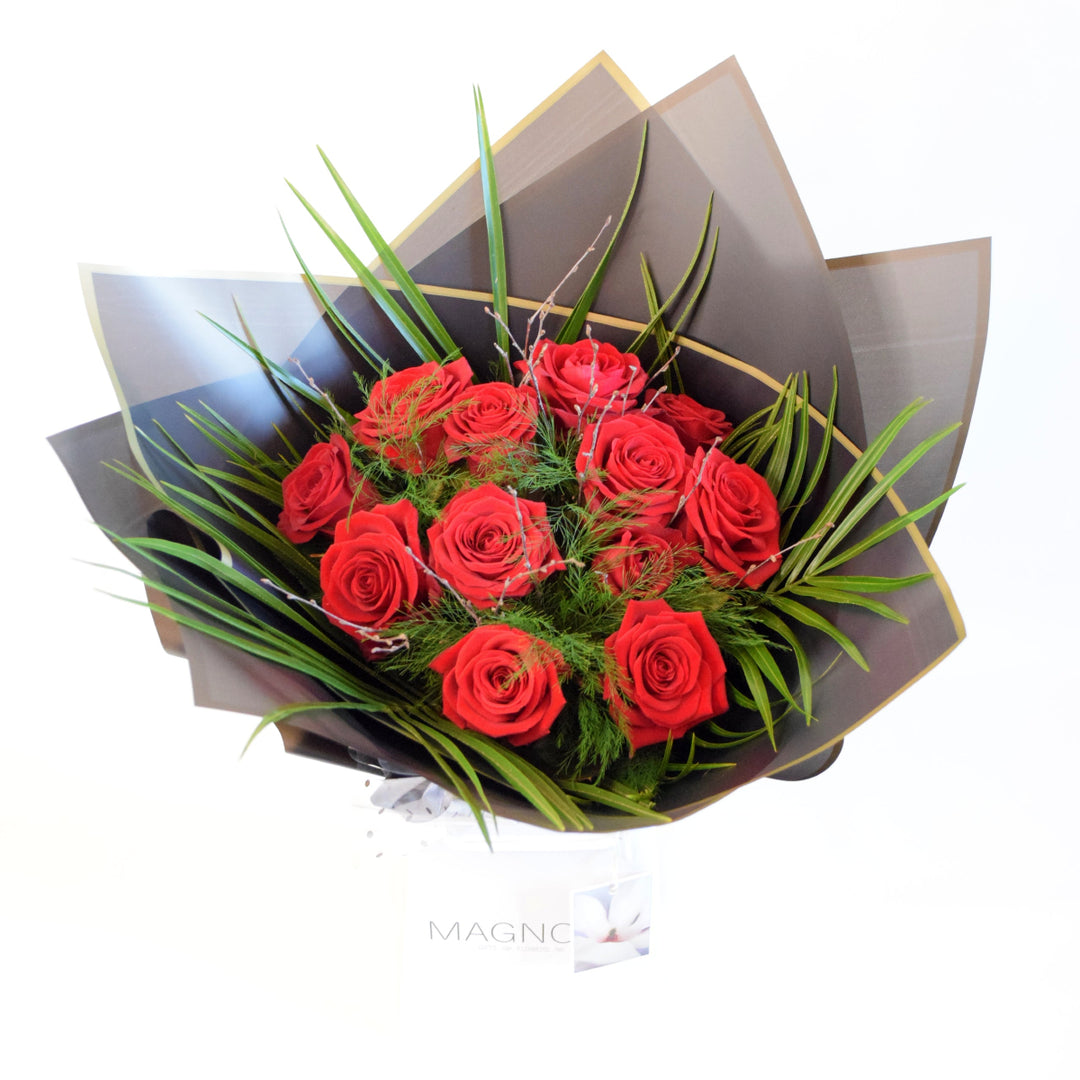 Truly In Love Hand-Tied Bouquet - Magnolia the Florist Indulge in the exquisite beauty of the Truly In Love Hand-Tied Bouquet from Magnolia the Florist. Luxury roses and lush foliage are lovingly arranged by hand, creating a unique masterpiece. Presented in our signature packaging, this bouquet is a luxurious gift that will leave a lasting impression. Please note this item requires 1-day notice to order. For scale purposes, our hand-tied box bags are 18cm (w) by 25cm (h).  1